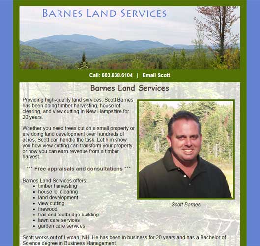 Barnes Land Services Created informational site for a land services business. Uses a background image that fits the theme of the business without making the text hard to read. Took all the photographs that are used on the site. |