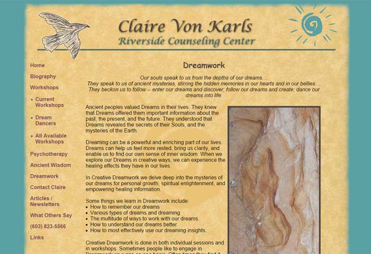 Claire Von Karls Designed website to be in harmony with this psychotherapist's services. Page layout and style elements are controlled via stylesheets making the actual HTML pages very straightforward for easy maintenance. Trained website owner and her assistant and provided them with supporting documentation so that they now perform website maintenance on their own, enabling them to keep the workshop schedule, and other aspects of the site, up to date. Set up ConstantContact template enabling the client to easily create and send HTML email newsletters. |