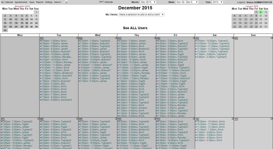 PPT Online Scheduling Created an online scheduling system for a gym's personal training appointments. Each trainer working at the gym has to log in to access the system. From there, they can input information about their clients, and schedule training appointments. A trainer has limited access to the system; an administrative user has full access to the system and can update the many settings that allow for very precise control of the gym's appointment load. Weekly activity and billing reports are automatically emailed to the administrator and active trainers. (This site requires a password to access.) |