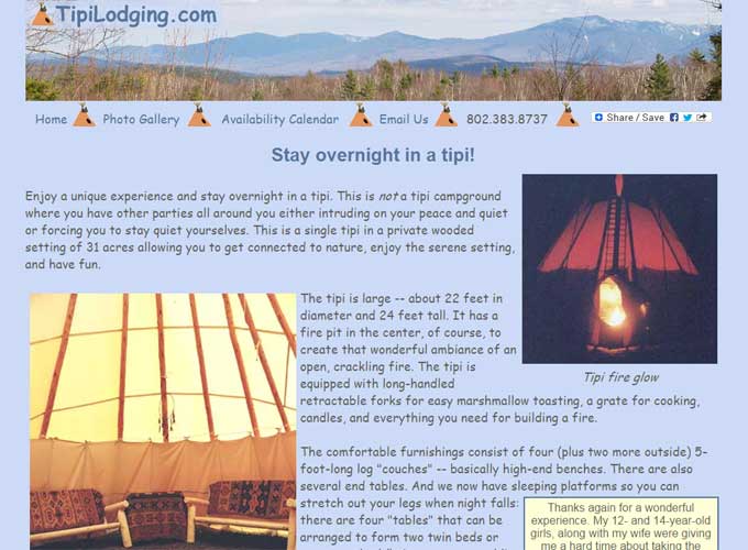 Tipi Lodging Created site to promote rental of a tipi. Highlighted boxes containing testimonials are interspersed amongst the text. Set up one of the images to show a different photo when the mouse is hovered over it – thus showing two very distinct views of the same object. Implemented a social media toolbar making it easy to share the site on Facebook, Twitter, etc. Created an availability calendar. |