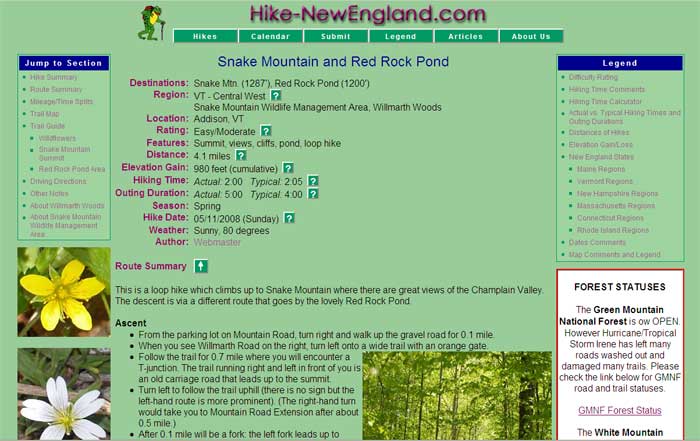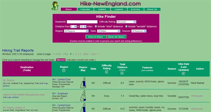 Hike New England Home page and trail report summaries are dynamically generated based on the contents of the database. Event calendar allows anyone to view free hiking events. Created "Hike Finder" so that vistors can perform detailed searches against the database based on attributes such as hike difficulty, region, distance, and keywords. Created a hiking time calculator allowing visitors to input distances, elevations, and walking paces in order to produce an estimated hiking time. Google ads and affiliate ads implemented as a revenue source. Created extensive administrative screens to allow for updating and querying the site's content. |