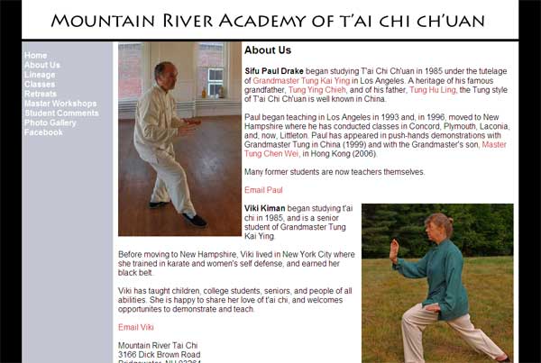 Mountain River Tai Chi Created website using CSS and HTML. Supplied several of the photographs that are used on the website. Created documentation so that owners can maintain the site themselves. Code and pages are structured in a modular fashion to make it easier for the owners to focus just on the content. |