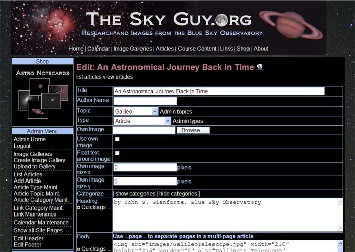 The Sky Guy Implemented Tiki content management system (CMS) on a MySQL database to create an astronomy site. Performed extensive customizations in PHP to make the site look attractive and function properly (there were many bugs and lots of ugliness in the out-of-the-box Tiki implementation). Implemented Google shopping cart, a "current moon phase" indicator, article management, photo galleries, and an event calendar. Created custom menus to make maintenance easier when in Admin mode. The left-hand image above shows a page as seen by the general public; the right-hand image is that same page in Admin (update) mode. Created extensive documentation describing the structure of the site and maintenance procedures so that the site owner has complete control over the content which he uses to publish articles as well as class-specific information and assignments for the courses he teaches. |
