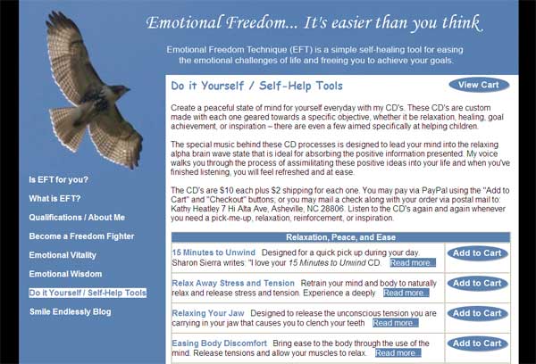 Emotional Freedom / EFT Totally redesigned the website in order to make the site cleaner and more concise both in terms of layout and content, while still conveying the original ideas and providing a peaceful experience. Created all website graphics, including the hawk which was from one of my photographs. Implemented PayPal shopping cart. Used AJAX to create collapsible/exandable descriptions for the long list of self-help CD's available for sale and organized the list into separate categories to make shopping easier. Implemented the ability to play background music while a visitor browses the site. |
